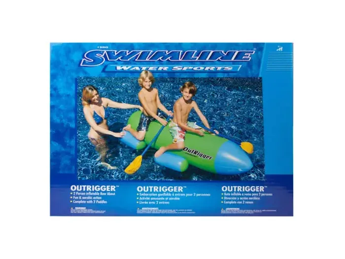 Experience adventure on the water with the Swimline Outrigger Inflatable Pool Raft with Paddles! Designed for two people aged 7 and up, this inflatable raft allows you to glide across your swimming pool in style. Measuring approximately 76 inches by 28 inches, it provides ample space for fun and enjoyment. Included are two sturdy plastic paddles to enhance your aquatic adventures. Packaged conveniently in an 18 inches x 12.75 inches x 3.5 inches box, it’s ready for your next pool party!