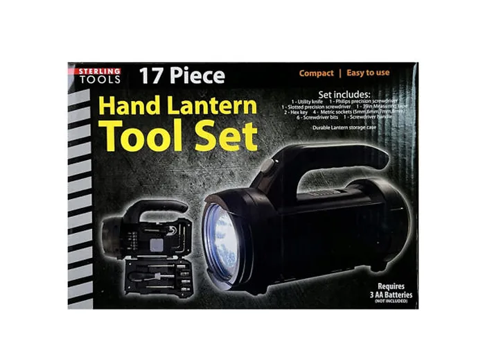 This convenient all-in-one 17 Piece Hand Lantern Flashlight Tool Set is a home and garage must-have! Whether you're working on a DIY home improvement project or fixing an emergency, this toolset comes with everything you need for every fix-it situation! This set includes one utility knife, one Philips precision screwdriver, one slotted precision screwdriver, one 39" measuring tape, one hex key, four metric sockets (5mm, 6mm, 7mm, 8mm), six screwdriver bits, one screwdriver all packaged inside a handheld flashlight. Requires 3 AA batteries - not included. Comes packaged inside a sturdy box.