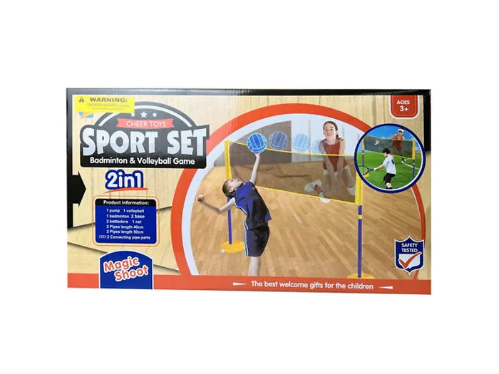 Create a Badminton or Volleyball tournament of champions from the comfort of your own home with this 2-in-1 Badminton and Volleyball Game Set. This outdoor activity is double the fun with 2 classic sports that's sure to bring competitive laughs. Easily sets up in your yard and other outdoor space such as the park or beach. Just fill the base with water, insert poles into base, attach the net and you're ready to play! Set includes net with base, 2 racquets, 1 birdie, 1 volleyball, 1 ball, and 1 ball pump. Net measures 39" wide x 51" with base attached. Set comes packaged inside a sturdy box. Measures approximately 20.25" x 2.95" x 11.4"
