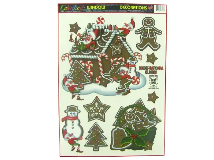 Included in the set are charming designs such as gingerbread men, a decorated Christmas tree, a delightful gingerbread house, and colorful candy canes. Each cling is reversible, showcasing the same vibrant design on both sides, making them easy to display on any window or mirror.