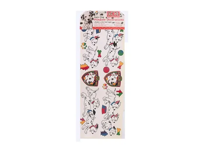 Add a touch of magic to your windows with these Disney's 101 Dalmatians static cling window decorations. This set includes two borders that combine for a total length of 4 feet and a height of 4 5/8 inches. Each border features a charming dalmatian crest alongside playful dalmatian pups engaging with colorful toys, bones, bowls, and houses.