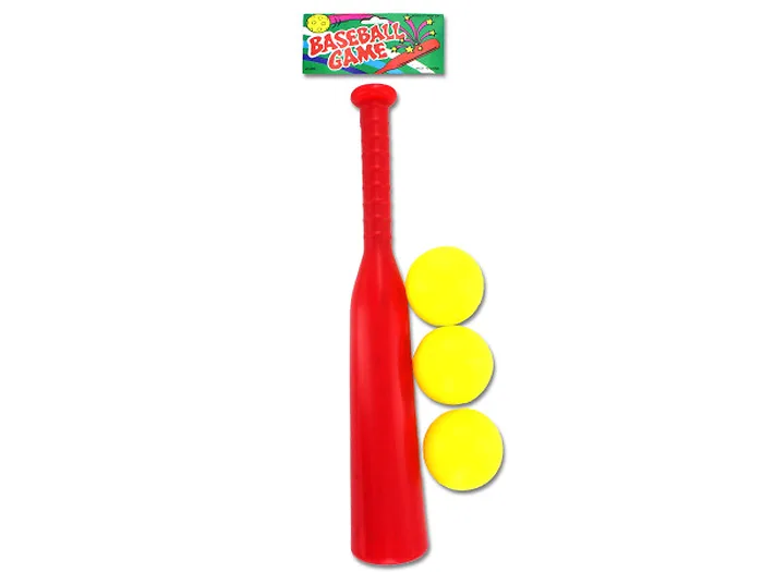 Perfect for smaller children, this 3-piece Plastic Baseball Set comes with a small red bat and three yellow balls. Bat measures approximately 15" with a 2 1/4" diameter base. Balls are 2 1/2" in diameter. Comes packaged in a poly bag with a header card.