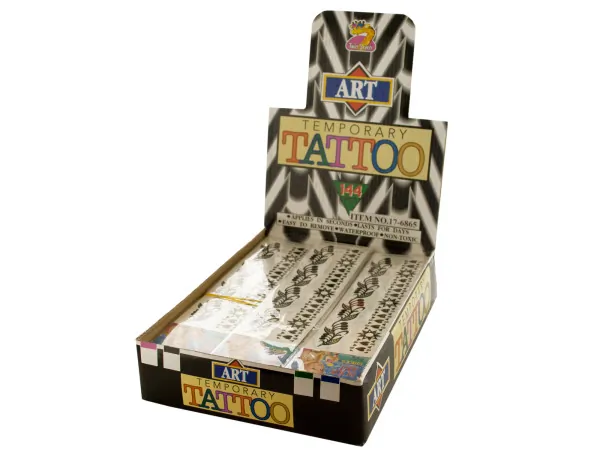 Safe and non-toxic, these tattoos come with clear instructions for application. Each tattoo sheet measures 8" x 2.125" and is packaged in a poly bag with a header card. Suitable for ages 5 and up, this counter top display includes 144 pieces in assorted styles.
