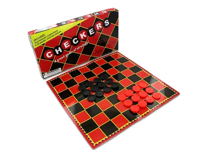 Experience the classic game of checkers with this compact and portable checkers game set. Designed for two players, it's perfect for family game nights, travel, or casual play at home. The set includes a fold-away game board and 24 high-quality plastic checker pieces. Ideal for players aged 5 and up, this game promises hours of fun and strategic gameplay, while being a great way to bond with friends and family.
