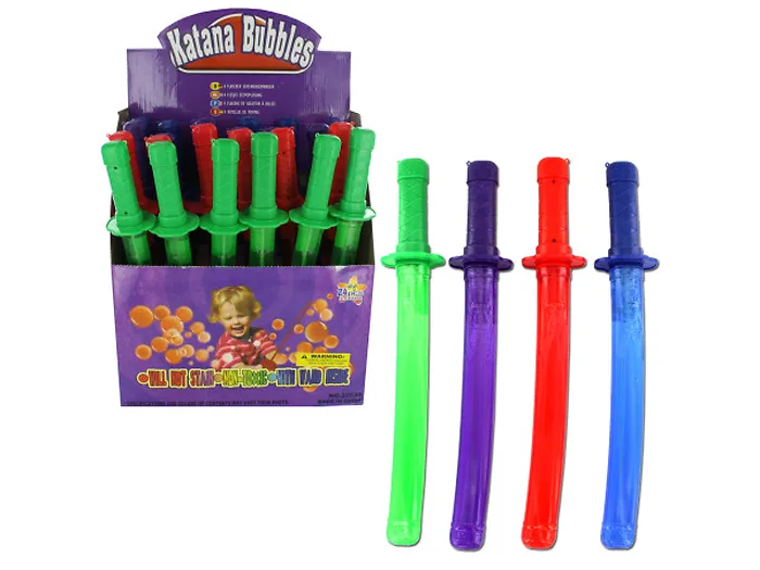 Perfect for spring and summer, these bubbles are packaged in a colorful sword style bottle. Bubbles fill the "blade" and the wand is the sword handle. Ideal for making large bubbles. Sword colors include red, blue, purple and green. Will not stain. Non-toxic. Not recommended for children under 3. Swords measure approximately 14 3/4" long. Countertop display comes with 24 pieces.