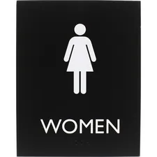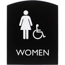 Accessible restroom sign for women features a sturdy frame that's made of durable plastic to provide a lasting display that will hold up for years. Female pictogram, accessible pictogram and capital letters that display the word women are colored white and positioned on a black background for a professional look. ADA-compliant sign also includes braille that is directly below the text to ensure everyone can read the message. Included foam tape secures instantly to surfaces for quick display in a visible location.