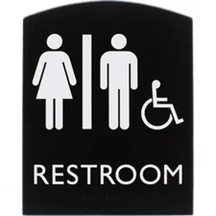 Accessible restroom sign for all genders features a tamper-resistant, protective lens to keep your sign looking like new for lasting readability. Female pictogram, male pictogram, accessible pictogram and capital letters that display the word restroom are colored white and positioned on top of a black background for a professional look. ADA-compliant sign also includes braille that is directly below the text to ensure everyone can read the message. Included foam tape secures instantly to surfaces for quick display in a visible location.