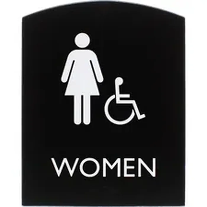 Accessible restroom sign for women features a tamper-resistant, protective lens to keep your sign looking like new for lasting readability. Female pictogram, accessible pictogram and capital letters that display the word women are colored white and positioned on top of a black background for a professional look. ADA-compliant sign also includes braille that is directly below the text to ensure everyone can read the message. Included foam tape secures instantly to surfaces for quick display in a visible location.