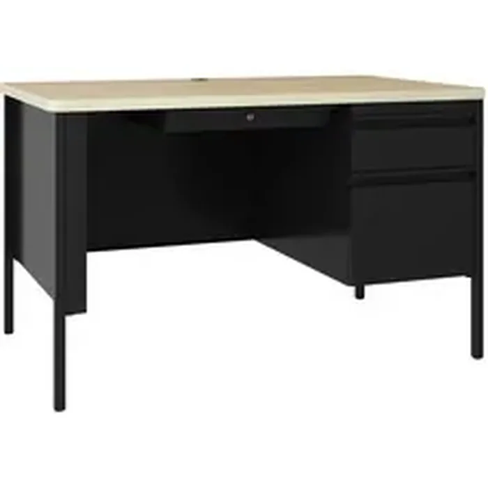 Single-pedestal desk belongs to the Lorell Fortress Series Teachers Desks that offer a practical and professional desk solution ideal for educational offices and classrooms. Durable, high-quality steel construction in black withstands rigorous daily use. The durable top features a T-mold edge to promote safety and high-performance, Maple laminate surface that is scratch-resistant, stain-resistant and water-resistant. Desk is also equipped a 3/4 modesty panel, locking center drawer and box/file pedestal on the right with full-extension, ball-bearing slides. Integrated drawer pulls are full-width. Central lock system locks all drawers. Steel construction and laminate top make the desk easy to clean and disinfect. Reinforced, double-frame inner structure keeps desk solid and sturdy for years of use. Steel desking meets or exceeds ANSI/BIFMA standards.