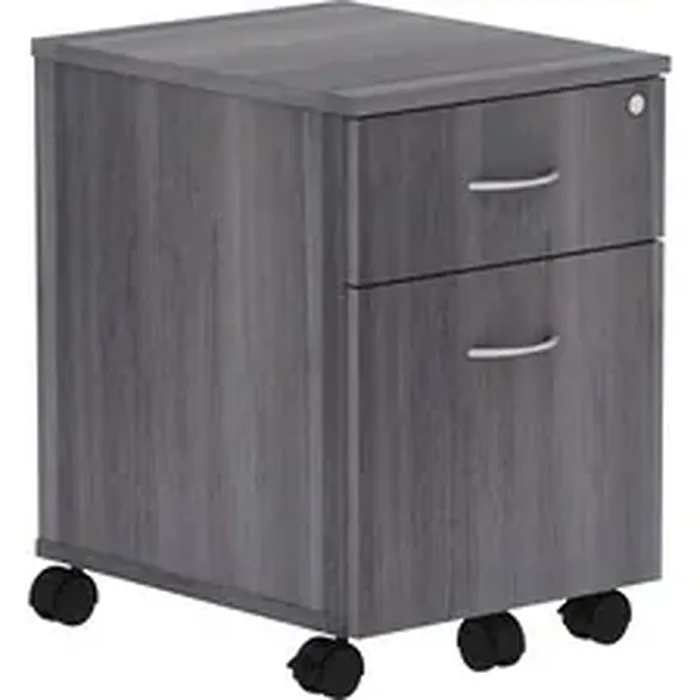 Mobile pedestal is part of the Lorell Relevance Series, versatile and stylish office furniture that configures to meet your needs. Weathered Charcoal laminate exterior matches other units in the series for a cohesive, professional look. Locking pedestal includes four dual-wheeled casters (two locking) for easy mobility, one box drawer for storing supplies and one file drawer for securing your letter-size hanging file folders. Adjustable leveling feet help keep the pedestal even on uneven surfaces.