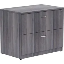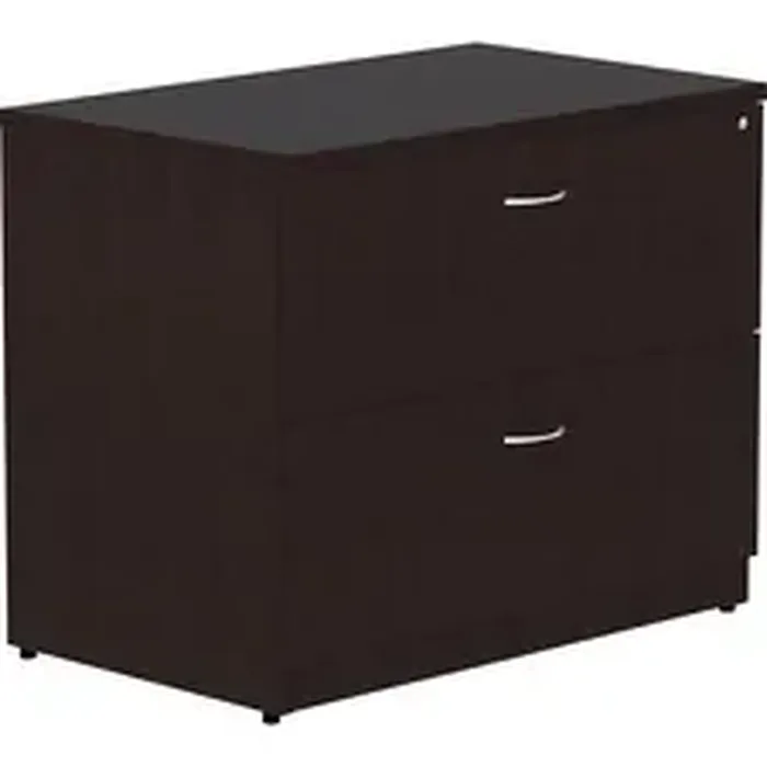Lateral file is part of Lorell Essentials Series Laminate Furniture with high-quality laminate construction and a contemporary design. Espresso laminate top is 1" thick for durability and is removable. File drawer accommodates letter-size and legal-size files with included hangrails. Both drawers roll smoothly on steel ball-bearings with full extension. Central locking system locks both drawers at once. Anti-tip feature allows only one drawer to be opened at a time. Design also includes 3mm PVC edges and adjustable levelers for stabilization.