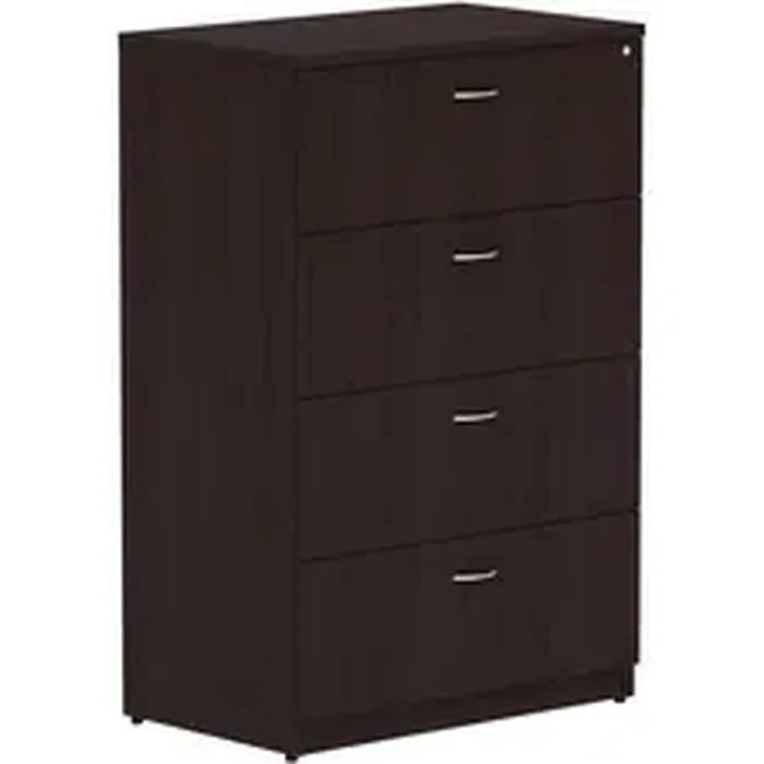Four-drawer lateral file is part of Lorell Essentials Series Laminate Furniture with high-quality laminate construction and a contemporary design. Espresso laminate top is 1" thick for durability. File drawer accommodates letter-size and legal-size files with included hangrails. Drawers roll smoothly on steel ball-bearings with full extension. Central locking system locks all drawers at once. Anti-tip feature allows only one drawer to be opened at a time. Design also includes 3mm PVC edges and adjustable levelers for stabilization.