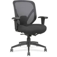 Mid-back chair features a body weight-control mechanism that moves with you. This chair control allows your body weight to recline the chair and return the chair to its task position for easier control. Self-tilt tension adjustment offers five locking positions. Other functions include 360-degree swivel and pneumatic seat-height adjustment from 18-1/4" to 22-1/4". The height-adjustable arms are covered with polyurethane pads for your comfort. Recline easily with the mesh back and seat upholstered with fabric. 27-1/6" diameter spider base is made of nylon and equipped with five 60mm dual-wheel casters for easy chair movement. Weight capacity is 275 lb. Seat measures 19-1/8" wide x 17-1/8" deep. Back dimensions are 19-9/31" wide x 21-6/23" high.