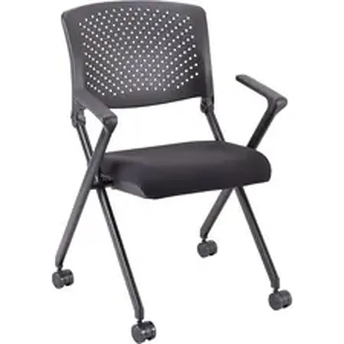 Plastic Back Nesting Chairs with arms feature a fabric-upholstered foldable seat that makes storing easy. Simply fold up the seat and collapse the legs to nest chairs for compact storage. Easy-to-clean plastic back is perforated for a stylish look. Molded cushion on the seat makes it more comfortable for your guests or training participants. Arms have plastic arm caps. Metal frame is powder-coated for durability and equipped for nylon casters for easy relocation.