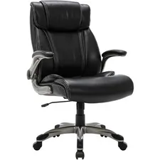 High-Back Leather Chair features a bonded leather with PVC upholstery for back and seat for elegant style and smooth comfort. Flip-up arms also offer bonded leather upholstery and flexibility to move out of your way when comfort demands. For better positioning, this executive chair also offers tilt/tilting lock mechanism with tilt tension adjustment, seat-height adjustment and 360-degree swivel. Five-star nylon base features dual-wheel casters. Capacity is 275 lb.