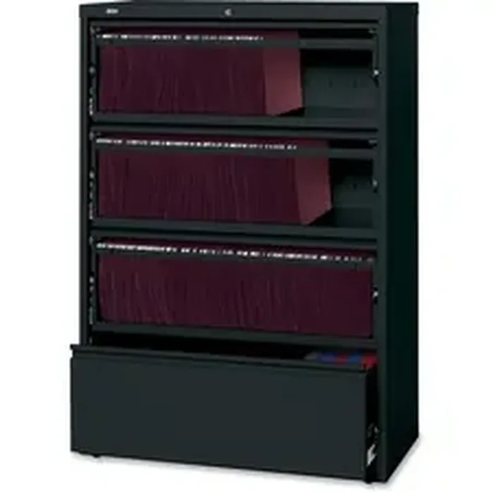 Receding lateral file with roll-out shelves offers a total of four drawers with heavy-duty, three-piece, ball-bearing slide suspension for smooth drawer movement. All drawers above the bottom one have receding fronts and roll-out shelves for easy access to your files. Bottom drawer has a fixed front. Included hangrails accommodate side-to-side filing of letter, legal or A4-size folders. Dual lock bars secure both ends of drawers. Interlock system prohibits the extension of more than one drawer at a time. 36" wide lateral file also features a core-removable lock; full-width designer drawer pulls; four adjustable leveling guides for stabilization and reinforced double-base construction. Lateral file does not include dividers. File meets/exceeds applicable ANSI/BIFMA standards.