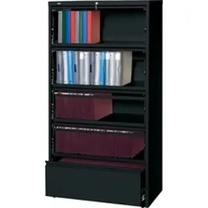Receding lateral file with roll-out shelves offers a total of five drawers with heavy-duty, three-piece, ball-bearing slide suspension for smooth drawer movement. All drawers above the bottom one have receding fronts and roll-out shelves for easy access to your files. Bottom drawer has a fixed front. The top two shelves feature roll-out binder storage. Included hangrails accommodate side-to-side filing of letter, legal or A4-size folders. Dual lock bars secure both ends of drawers. Interlock system prohibits the extension of more than one drawer at a time. 36" wide lateral file also features a core-removable lock; full-width designer drawer pulls; four adjustable leveling guides for stabilization and reinforced double-base construction. Lateral file does not include dividers. File meets/exceeds applicable ANSI/BIFMA standards.