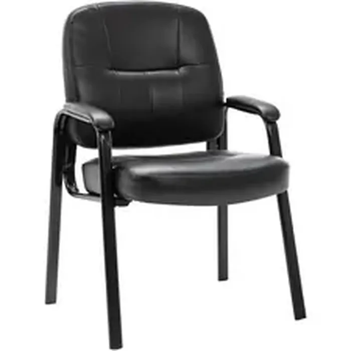 Executive guest chair offers a sophisticated look for any lobby, reception area or conference room. Design features fully upholstered seating with black, split leather for a rich classic look. Guest chair features stylish open loop arms and a black steel frame. Seat height is 18-3/4". Chair meets the CA117 fire-retardant standard.