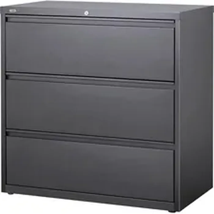 42" wide lateral file features three versatile drawers with hanging file rails for side-to-side filing of letter-size, legal-size or A4-size folders. Each drawer has a magnetic label holder for easy identification where you need it. Design also features a core-removable lock for security, dual locking bars, full-width pull, ball-bearing slide suspension for smooth opening and closing, reinforced base, and four adjustable leveling guides for stabilization. Interlock system prohibits the extension of more than one drawer at a time for your safety. Counterweight prevents tipping. Lateral file meets or exceeds applicable ANSI/BIFMA standards.