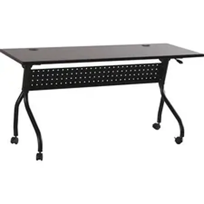 Part of the Lorell Preference Series, this versatile training table offers flexible configurations and convenient storage. Use individually or secure together into rows with a reliable metal connector (sold separately). Espresso top flips up for easy storage without having to remove the connector. Top features a melamine surface with a 3mm PVC straight edge. Two grommets allow easy cord management. Four-leg, all-metal black base features a one-way fold and modesty panel. Table rolls easily on four nylon casters with brakes.