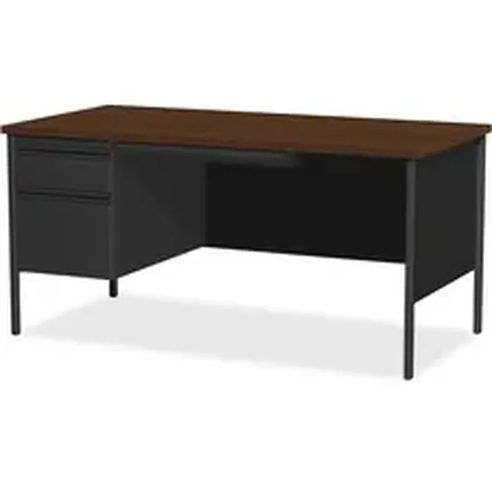 66" wide single-pedestal desk is part of the Lorell Fortress Series, a practical and professional desk solution ideal for business, government and educational offices. Use this left-pedestal desk with a Fortress right return for L-shaped configurations. Both have 3/4-height modesty panels for seamless lines. High-performance steel construction stands up to rigorous daily use. The 1-1/8" thick top with square edges features a Walnut laminate surface that is scratch-resistant, stain-resistant and water-resistant. Desk design also features a box/file pedestal on the left. Both drawers lock and offer full-extension, ball-bearing slides and full-width, integrated drawer pulls. File drawer accommodates letter-size files. Central-locking center drawer features a core-removable lock. Two grommets allow easy cord management. Reinforced, double-frame inner structure keeps desk solid and sturdy for years of use. Steel desk in black meets or exceeds ANSI/BIFMA standards.