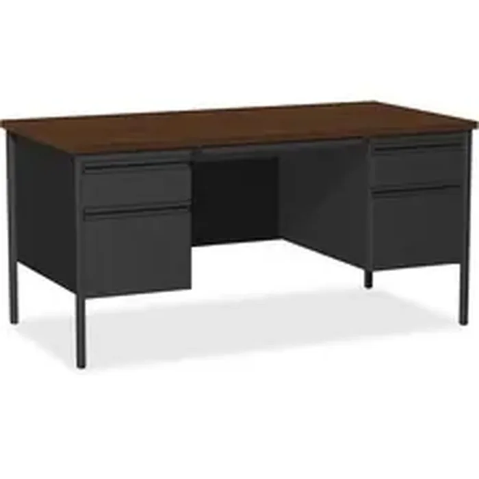 Double-pedestal desk is part of the Lorell Fortress Series, a practical and professional desk solution ideal for business, government and educational offices. Durable, high-performance steel construction stands up to rigorous daily use. The 1-1/8" thick top with square edges features a Walnut laminate surface that is scratch-resistant, stain-resistant and water-resistant. Design also features a 3/4-height modesty panel and box/file pedestal on both sides. Drawers lock and offer full-extension, ball-bearing slides and full-width, integrated drawer pulls. File drawers accommodate letter-size files. Central-locking center drawer features a core-removable lock. Two grommets offer easy cord management. Reinforced, double-frame inner structure keeps desk solid and sturdy for years of use. Steel construction and laminate top make the desk easy to clean and disinfect. Steel desk in black meets or exceeds ANSI/BIFMA standards.