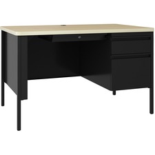 66" wide single-pedestal desk is part of the Lorell Fortress Series, a practical and professional desk solution. Use this right-pedestal desk with a Fortress left return for L-shaped configurations. Both have 3/4-height modesty panels for seamless lines. High-performance steel construction stands up to rigorous daily use. The 1-1/8" thick top with square edges features a Maple laminate surface that is scratch-resistant, stain-resistant and water-resistant. Desk design also features a box/file pedestal on the right. Both drawers lock and offer full-extension, ball-bearing slides and full-width, integrated drawer pulls. File drawer accommodates letter-size files. Central-locking center drawer features a core-removable lock. Two grommets allow easy cord management. Steel construction and laminate top make the desk easy to clean and disinfect. Reinforced, double-frame inner structure keeps desk solid and sturdy for years of use. Steel desk in black meets or exceeds ANSI/BIFMA standards.
