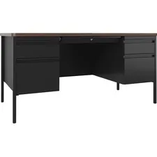 Single-pedestal desk belongs to the Lorell Fortress Series Teachers Desks that offer a practical and professional desk solution ideal for educational offices and classrooms. Durable, high-quality steel construction in platinum withstands rigorous daily use. The durable top features a T-mold edge to promote safety and high-performance, white laminate surface that is scratch-resistant, stain-resistant and water-resistant. Mobile desk is also equipped a 3/4 modesty panel, locking center drawer and box/file pedestal on the right with full-extension, ball-bearing slides. Integrated drawer pulls are full-width. Central lock system locks all drawers. Desk also features two locking casters and two nonlocking casters. Steel construction and laminate top make the desk easy to clean and disinfect. Reinforced, double-frame inner structure keeps desk solid and sturdy for years of use. Steel desking meets or exceeds ANSI/BIFMA standards.