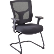 Mid-century modern-inspired guest chair with low-profile arms is upholstered with stylish gray flannel fabric for a professional look. Seat and back are cushioned for comfort. Stable sled base is powder-coated for durability and features adjustable glides. Guest chair meets or exceeds ANSI/BIFMA standards.