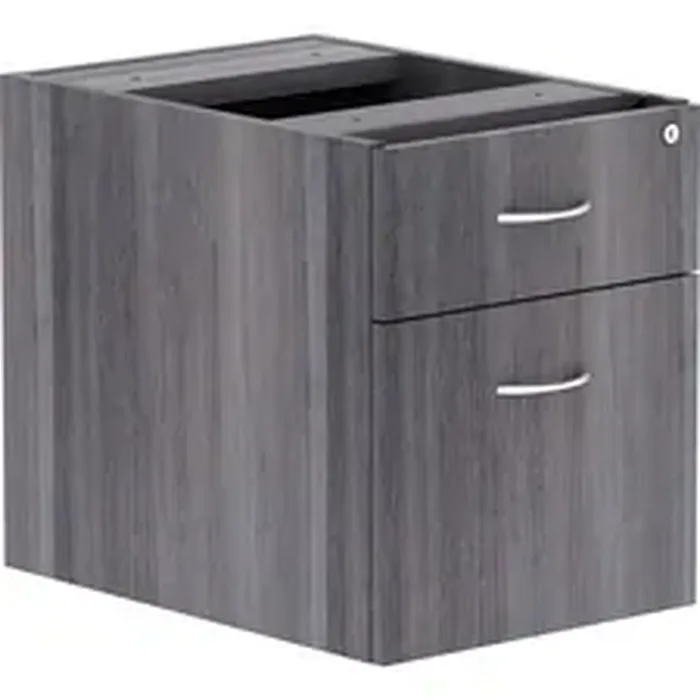 Hanging pedestal is part of Lorell Essentials Series Laminate Furniture with high-quality laminate construction and metal-to-metal, cam-lock connections. Pedestal includes one box drawer for supplies and one filing drawer that accommodates letter-size and legal-size files with included hangrails. Both drawers offer full extension and roll smoothly on steel ball bearings. Design also includes central locking, Weathered Charcoal laminate for durability and 3mm PVC edges. Pedestal cannot be used freestanding and must be attached to a desk, credenza or return in this series. Predrilled holes with metal inserts offer easy attachment by screws.