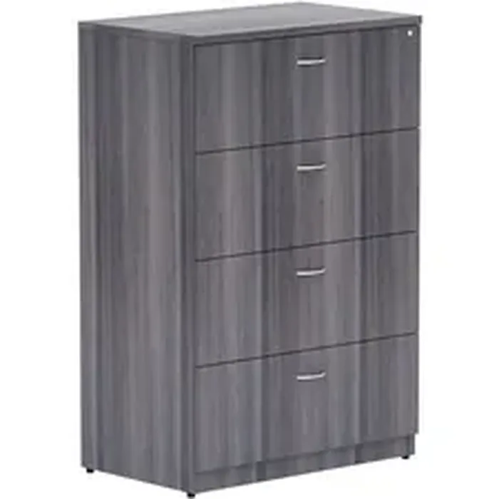 Four-drawer lateral file is part of Lorell Essentials Series Laminate Furniture with high-quality laminate construction and a contemporary design. Weathered Charcoal laminate top is 1" thick for durability. File drawer accommodates letter-size and legal-size files with included hangrails. Drawers roll smoothly on steel ball-bearings with full extension. Central locking system locks all drawers at once. Anti-tip feature allows only one drawer to be opened at a time. Design also includes 3mm PVC edges and adjustable levelers for stabilization.