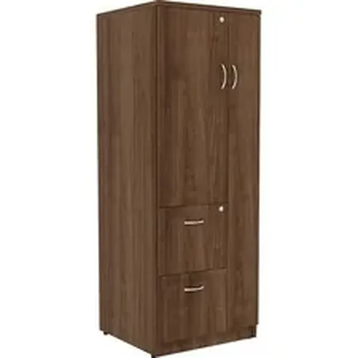 Tall storage cabinet is part of Lorell Essentials Series Laminate Furniture with high-quality laminate construction and metal-to-metal, cam-lock connections. Design of the cabinet expands your storage opportunities with the varied sizes of compartments. Full-length compartment on the right features a door to conceal contents. On the left, the half-length compartment includes a locking door and two shelves. The bottom two drawers lock to secure your belongings and hold letter-size files. Durable, Walnut laminate surfaces provide a professional look and are abrasion-resistant. The back is finished on both sides. Cabinet is made of particleboard and medium-density fiberboard. Adjustable levelers help stabilize the cabinet on uneven surfaces.