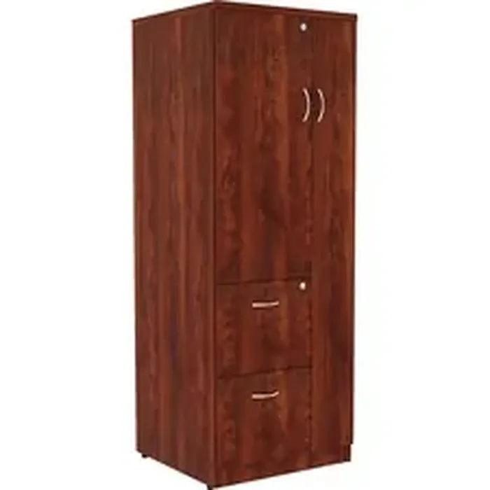 Tall storage cabinet is part of Lorell Essentials Series Laminate Furniture with high-quality laminate construction and metal-to-metal, cam-lock connections. Design of the cabinet expands your storage opportunities with the varied sizes of compartments. Full-length compartment on the right features a door to conceal contents. On the left, the half-length compartment includes a locking door and two shelves. The bottom two drawers lock to secure your belongings and hold letter-size files. Durable, Cherry laminate surfaces provide a professional look and are abrasion-resistant. The back is finished on both sides. Cabinet is made of particleboard and medium-density fiberboard. Adjustable levelers help stabilize the cabinet on uneven surfaces.