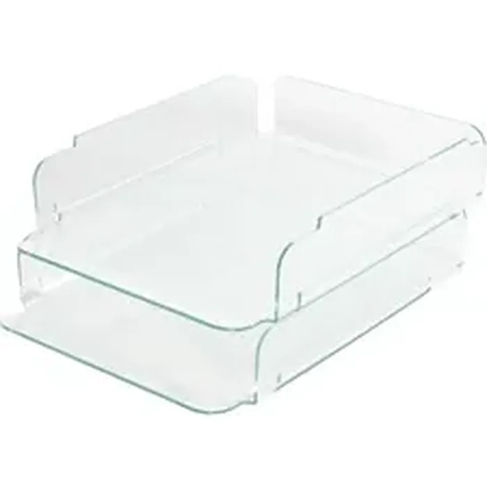 Stacking letter trays offer a durable, lightweight design with polished edges. Smooth, curved edges feature a hint of green to emulate the look of real glass. Nonskid feet protect desktop surfaces and keep your important papers on your desktop. Capacity is 2-1/2". Letter trays are made of durable acrylic and do not require stacking supports for stacking.