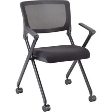CHAIR,TRAIN,MESH,2/CT Lorell Mesh Back Fabric Seat Nesting Chairs Versatile, nesting chairs work great in your training or reception area. Mesh back, fabric seat and arm rests offer comfortable seating. Four legs include swivel casters for easy chair movement. Metal frame features a powder-coat finish for durability. Folding seat allows chairs to nest for space-saving storage. Color:BLACK 56112103
