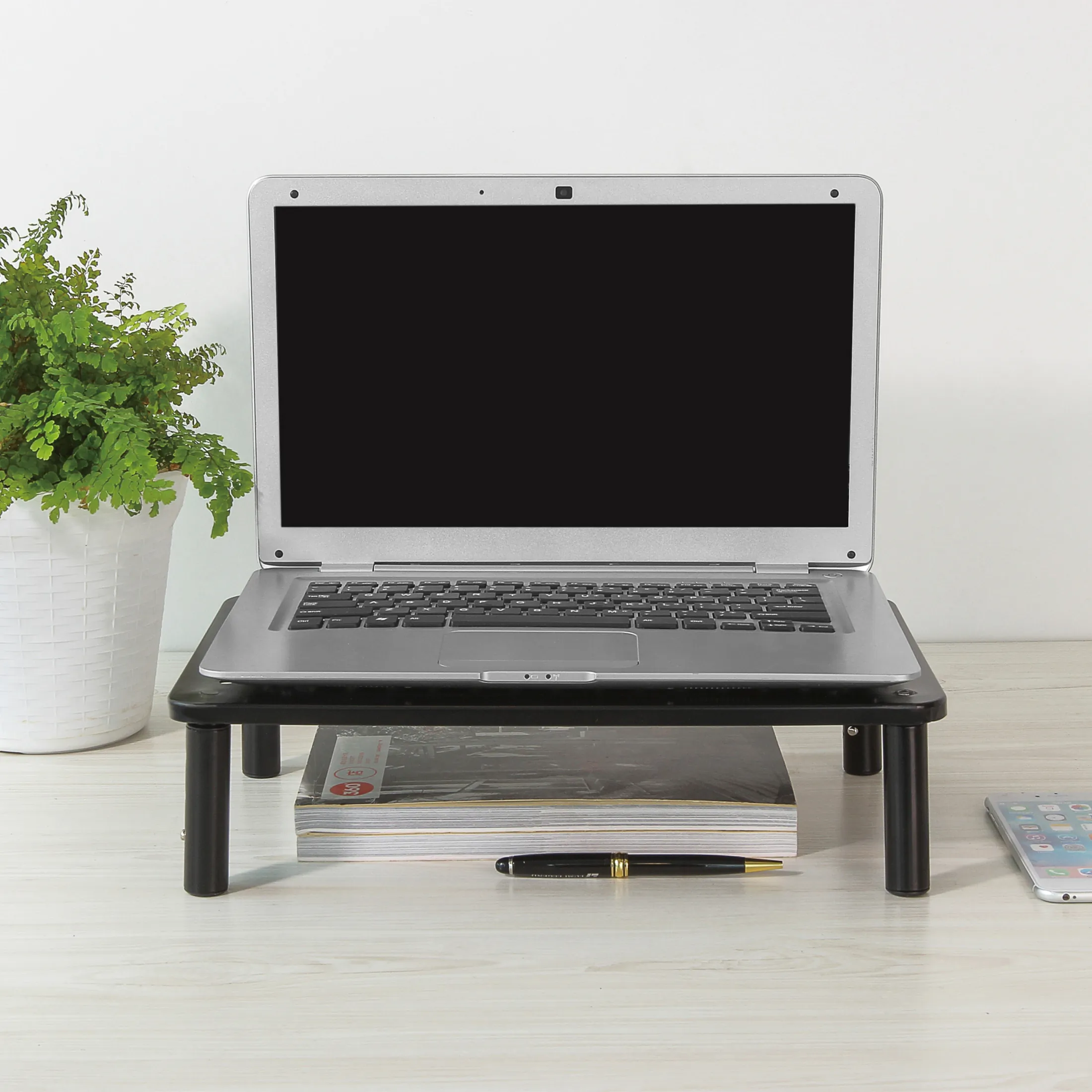 Elevate your desktop style using this Glass Monitor Stand with four legs. The four black legs lift your monitor 3" off your desktop for a more comfortable eye level. Glass surface matches glass desk accessories and provides a clear view of items you store under the monitor stand's single shelf.