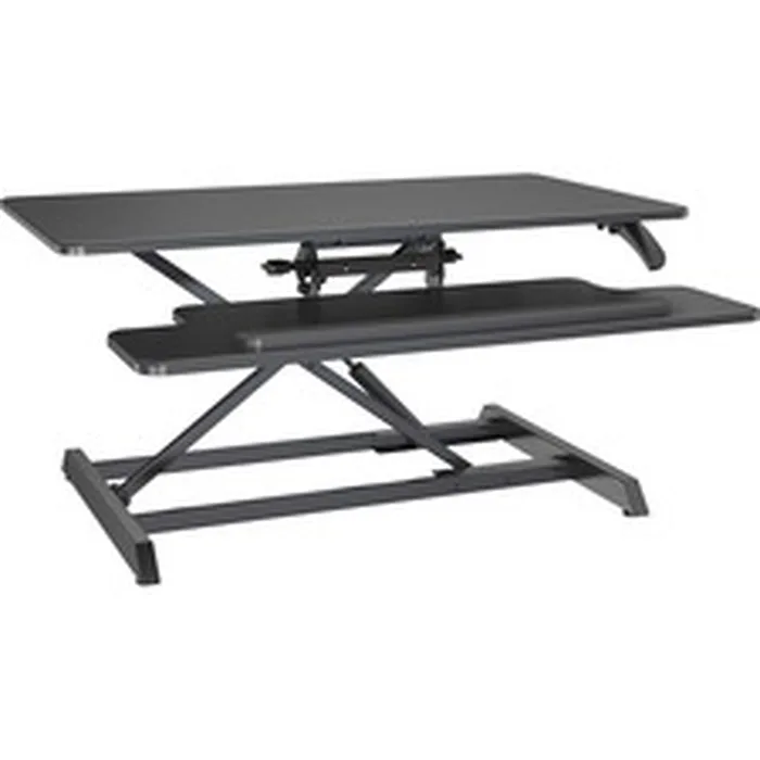 Desk riser allows you to go from sitting to standing with ease. Stop easily at any position from 5-1/8" x 19-1/4" when adjusting the height. Desk riser operates with a gas-spring monitor lift for smooth, easy ascension. The 23-1/4" x 12-3/8" keyboard tray tilts between negative 5 and positive 15 degrees and offers a 20mm height-adjustment range. The X-type frame is made of sturdy steel. Worksurface and tray are made of medium-density fiberboard with PVC finish. Desktop weight capacity is 33 lb. Keyboard tray can hold up to 4.4 lb.