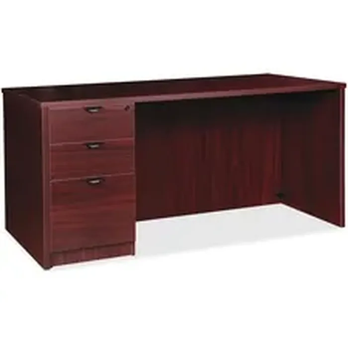Left-pedestal desk is part of the elegant, Lorell Prominence 2.0 Series that is perfect for your executive office. Pair with single-pedestal desks, returns and bridges to create L-shaped and U-shaped configurations. Durable, Mahogany laminate surface is mar-resistant, burn-resistant and impact-resistant to withstand daily work life. The 1" thick top with matching 3mm edgebanding is made with 45 lb. density particleboard and finished on both sides with high-performance, thermally fused melamine. The 72" wide desk features a full modesty panel for privacy, two grommets in the top, and a full pedestal with locking drawers to secure files and supplies. Pedestal includes two box drawers for supplies and one file drawer for letter-size or legal-size hanging files with included hangrails. Box and file drawers have 100 lb. full-suspension, ball-bearing slides. The 3/4" adjustable glides allow desk to remain level on uneven surfaces. Desk ships fully assembled so it's ready for immediate use.