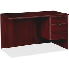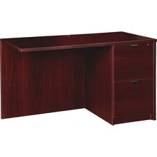 Right return is part of the elegant, Lorell Prominence 2.0 Series that is perfect for your executive office suites. It is not freestanding. Pair with left-pedestal desks or credenzas to create L-shaped and U-shaped configurations. Durable, Mahogany laminate surface is mar-resistant, burn-resistant and impact-resistant to withstand hectic, daily work life. The 1" thick top features matching 3mm edgebanding. Return is made with 45 lb. density particleboard and finished on both sides with high-performance, thermally fused melamine. Return features a full modesty panel for privacy and a full pedestal with two locking file drawers to secure important files. File drawers hold letter-size or legal-size hanging files with included hangrails and have 100 lb. full-suspension, ball-bearing slides. The 3/4" adjustable glides allow return to remain level on uneven surfaces. Grommet in the top worksuface allows convenient cord management. Return ships fully assembled so it's ready for immediate use.