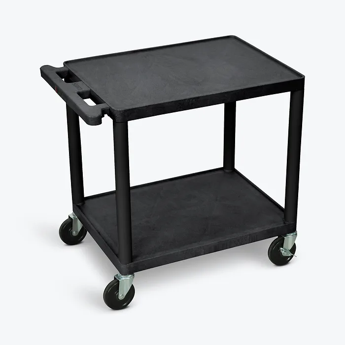 Made in the USA, this sturdy, two-shelf AV cart is designed to hold and haul up to 400 lbs. of equipment. Made of molded plastic, the durable shelves and legs won't scratch, dent, rust or stain. Shelves also feature a .25" retaining lip to prevent contents from sliding off. Maneuvering the cart when empty or fully loaded is easy thanks to four 4" full-swivel casters (two with locking brake) and an ergonomic push handle molded into the top shelf.