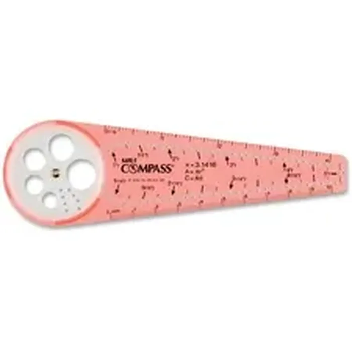 This durable, 6" flat compass can draw circles from 1/4" to 10" in diameter. Unique design eliminates the sharp point found on traditional compasses. It can be used with assorted writing instruments. Use the internal circle templates on one end. Two built-in, mini rulers offer measurements in 1/16" along one edge and millimeters on the other. You can also insert your writing utensil in one of the pre-punched holes along the ruler to make a certain size circle. Compass is made with shatter-resistant SAFE-T plastic.