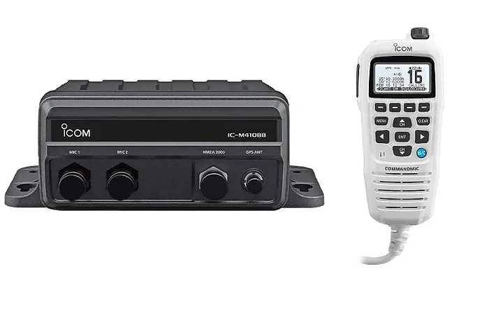 Model: M410 BB GW 11 USAIcom's M410BB is a flexible black box fixed mount that provides VHF communications for vessels with limited helm space. The supplied CommandMicTM controls the radio for essential communications on the water.