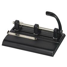 Two-hole punch offers a padded, oversized handle to cushion your hand when punching. Hole punch drills through up to 40 sheets of 20 lb. bond paper. Oversized 9/32" punch heads allow easier page-turning. Nonskid feet keep the hole punch in place while punching. Lock down handle for storage and safety. Two-hole punch also features 2-3/4" center; adjustable, ruled paper guide; heavy-gauge steel construction and a no-mar chip pan.