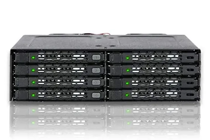 General InformationNo data storage enclosure is complete without reliable drive connections, and proper drive protection. Many enterprise applications rely on their data to run their business, and any major downtime or data loss can be crippling. The ToughArmor MB998IP-B utilizes a rugged full-metal removable drive enclosure, and the latest in drive connection technology, to bring you the best in stability, speed, and reliability. For your dense data storage needs, it holds an unprecedented 8x 2.5" SAS / SATA hot-swappable drives with 5mm-7mm height, all in a single 5.25" bay. The two Mini-SAS HD (SFF-8643) connectors at the rear of the unit makes it easy to connect to a modern RAID card and reduce cable clutter, while offering additional bandwidth and reliability over SATA connections. The dual 40mm user-controllable cooling fans and ventilated metal case keep your drives running longer, even under the toughest of loads. The fan has three modes the user can set; high, low, and off. The ToughArmor MB998IP-B features a rugged heavy duty full-metal enclosure designed to handle I/O intensive applications such as data mining, information retrieval, video processing, HPC, VDI, cloud service, database, and server. Countless Options in a Single Bay To maximize its storage density and compatibility, the ToughArmor MB998IP-B supports 8 x 5-7mm 2.5" SAS / SATA SSD or Hard disk drive, and only uses one standard external 5.25" computer bays (DVD-ROM bays). The MB998IP-B's compact, dense design makes it perfect for workstations, compact servers, gaming rigs, home servers, and HPCs that require high IOPS, high capacity, and low latency storage access. It works well in advanced RAID configurations such as RAID 6 or RAID 10 arrays, due to its use of 2x Mini-SAS HD (SFF-8643) connectors, and can be controlled by a single RAID card. The Mini-SAS HD connector is designed to improve the ease of installation and vastly reducing cable clutter, using only two cables compared to eight SATA cables. Mini-SAS HD can travel further without data loss, keeping your data transfers clean and secure in all situations. The use of Mini-SAS HD makes the MB998IP-B compatible with a wide variety of SAS expanders and RAID cards, making it easier to use in enterprise environments. Using the EZ Slide Nano trays makes drive interchangeability and maintenance completely hassle free. For drive security, the Eagle-hook lock system on the tray makes sure your hard drives will not eject when not needed. The trays are designed to accommodate 5 to 7mm height hard drives and SSDs, creating a 2.5" hot swap bay for any standard SATA / SAS hard drives and SSDs. Maximum Reliability and Stability Ensuring the safety of your valuable data is the foundation to any good system build or design. The MB998IP-B is capable of holding up to the most demanding environments with its rugged, heavy duty, full-metal construction in the entirety of the body and its smaller components. The ToughArmor's rugged full metal design is also perfect for industrial and medical devices that may require a flammability rating as the full metal material is considered to be already compliant with flammability requirements. In addition, the Anti-Vibration Technology (AVT) and EMI grounding ensure a stable platform for the drives being used, vastly improving reliability and drive longevity. The full metal construction of MB998IP-B allows for maximum heat dissipation, and combined with the dual 40mm cooling fans, keeps your drives at an optimal temperature even under intense access activity.Technical InformationNumber of Hard Drives Supported: 8Number of Hard Drives Installed: NoNumber of Solid State Drive Supported: 8Number of Solid State Drive Installed: No