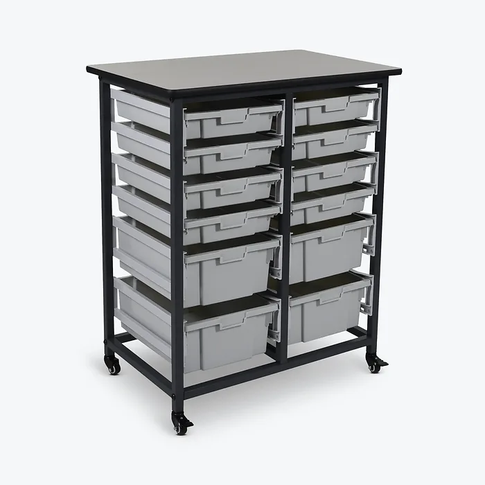 Introducing the Luxor Double Row Mobile Bin System, designed for versatile storage solutions that adapt to your needs. This mobile system features a mix of four 6"-deep and eight 3"-deep polypropylene bins, making it perfect for organizing classroom supplies, garage tools, parts, and more. Each bin can hold up to 20 lbs., ensuring that both large and small items are securely stored. The durable steel frame and guide rails keep your bins in place while you work or move the unit, and it’s easy to maneuver thanks to four rolling casters, two of which are equipped with foot-activated brakes.