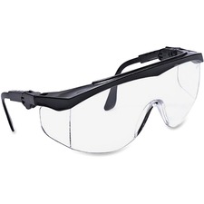 Safety glasses feature durable, metal alloy temples with nonslip temple sleeves for a comfortable, secure fit. Scratch-resistant coating ensures high visibility and long-lasting use. Rimless design offers excellent unobstructed vision. Clear, polycarbonate lens filters 99.9 percent of UV rays.