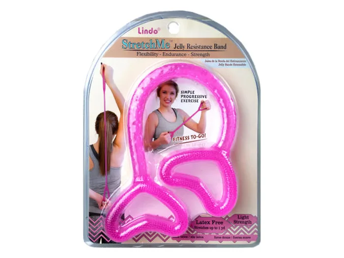 Tone and strengthen your body with this continuous resistance band. The Stretch ME Jelly Resistance band provides flexibility, endurance, and strength. It tightens and firms while strategically using low-impact training. The resistance band helps target specific muscle groups for total body conditioning. It is perfect for travel and stretches up to 1 yard. The light strength Pink band is latex free. It comes packaged in a hanging blister pack of 9" x 6.75". The band is approximately 12.50" in length.