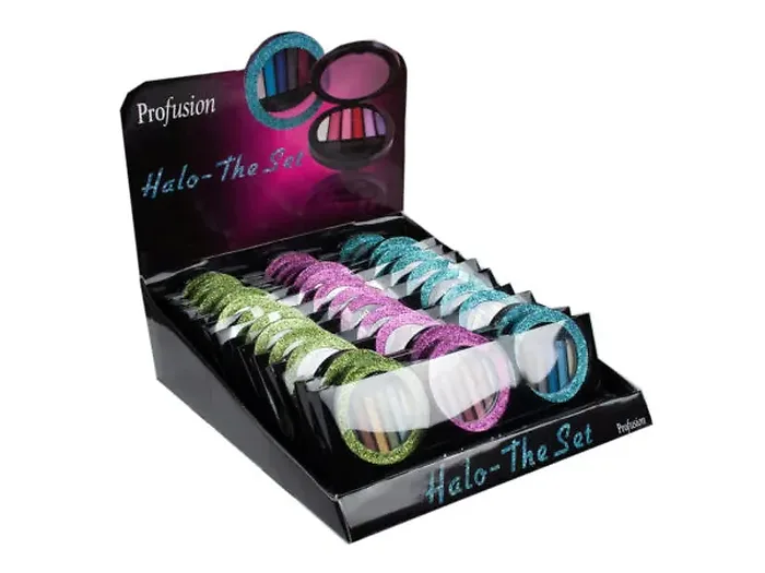 Choose from soft, natural, and bold colors from Profusions Halo Eyeshadow 3-pack palettes. Create dazzling looks at home or on the go; the palettes include a double-ended brush. The small container is perfect for storing in your bag, drawers, and more. The glitter accent case distinguishes sets by color. Palettes come packaged in a 9.75" x 3.25" x 0.75" plastic box. The set is in a countertop display. The display has an inner pack of 12 sets of 3 palettes.
