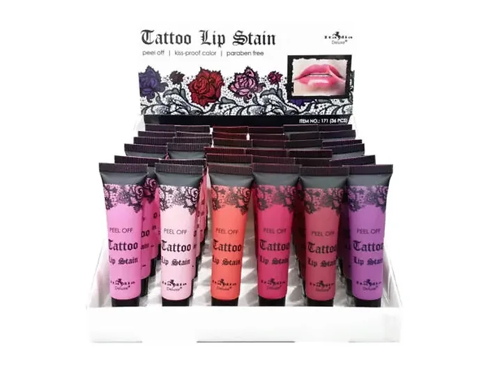 Packaged in a well-designed countertop display measuring approximately 7.50" x 7.50" x 7.50", this set includes 36 Tattoo Lip Stains, ensuring you'll always have a stunning shade at your fingertips.