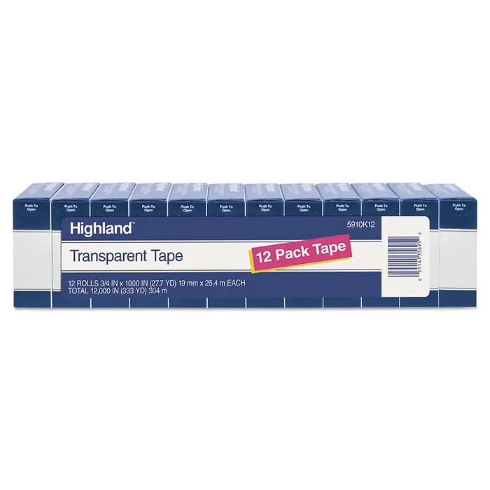 3M Highland Transparent Light-duty Tape - 27.78 yd Length x 0.75" Width - 1" Core - Transparent - Polypropylene Film - Acrylic Adhesive - Desktop Dispenser - For Packaging, Envelope, Mending, Sealing, Holding, Protecting - 12 / Pack